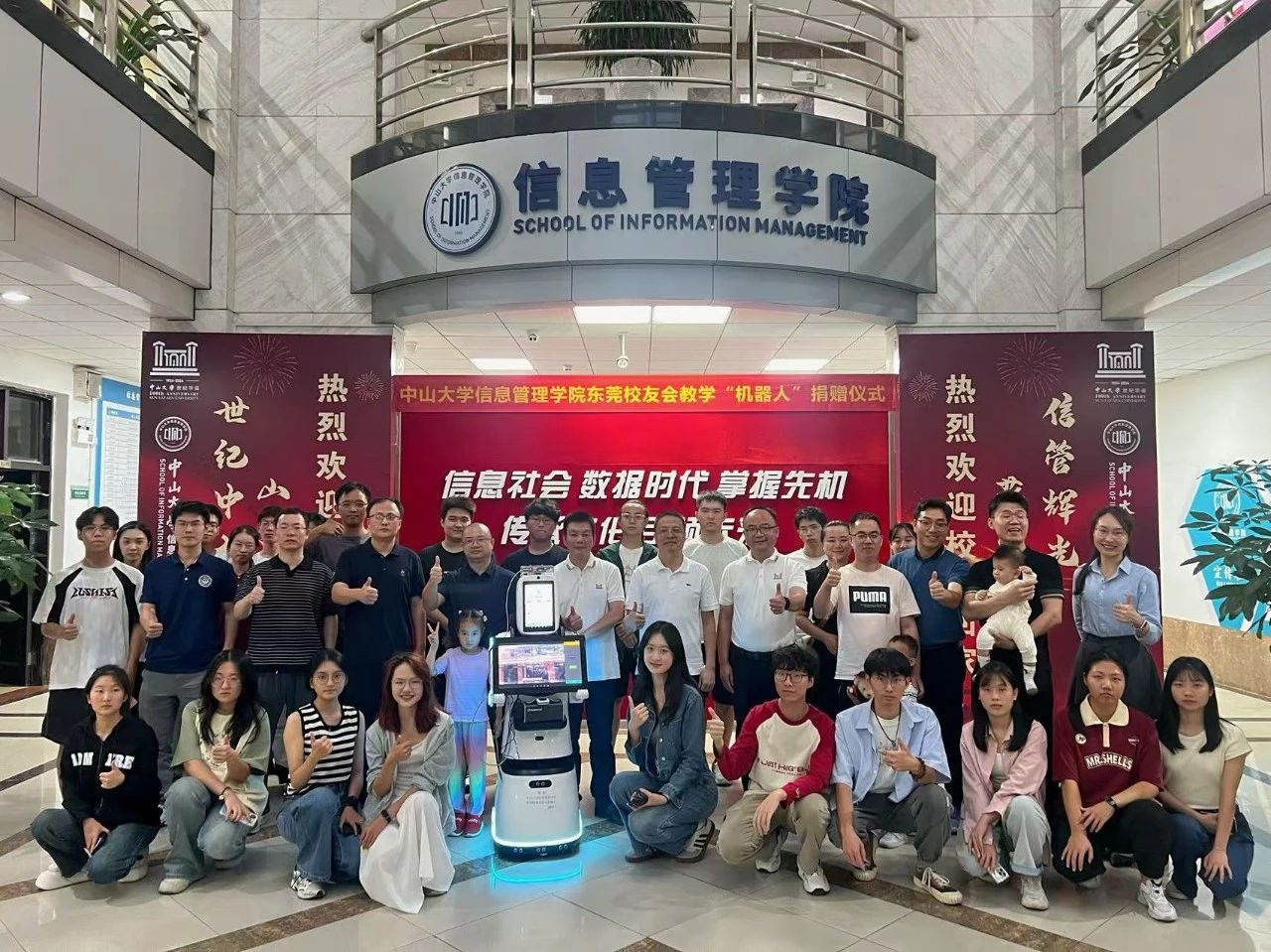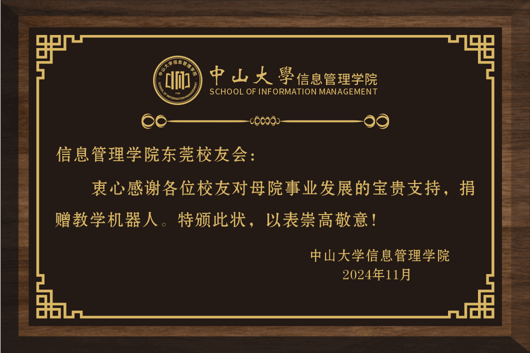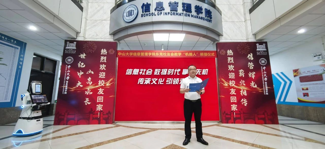 世纪中大,山高水长,信管辉光,薪火相传。11月3日下午,永利yl23411东莞校友会教学“机器人”捐赠仪式在永利yl23411大堂举行。我院东莞校友会献礼百年校庆,特捐赠支持教学机器人一台。“机器人”取名“小信”,具有学院资讯问答、学院导航引路、预订学院课室等政务服务功能,同时提供了人工智能、软件开发、信息技术等专业技术科研攻关和教学实践功能,对今后学生培养具有重要意义。我院东莞校友会会长罗日辉等校友代表参加活动,学院院长张洋教授、党委书记林俊洪、副书记吴曼瑜、李岱峰教授和学生代表共同见证了捐赠仪式,活动由吴曼瑜副书记主持。