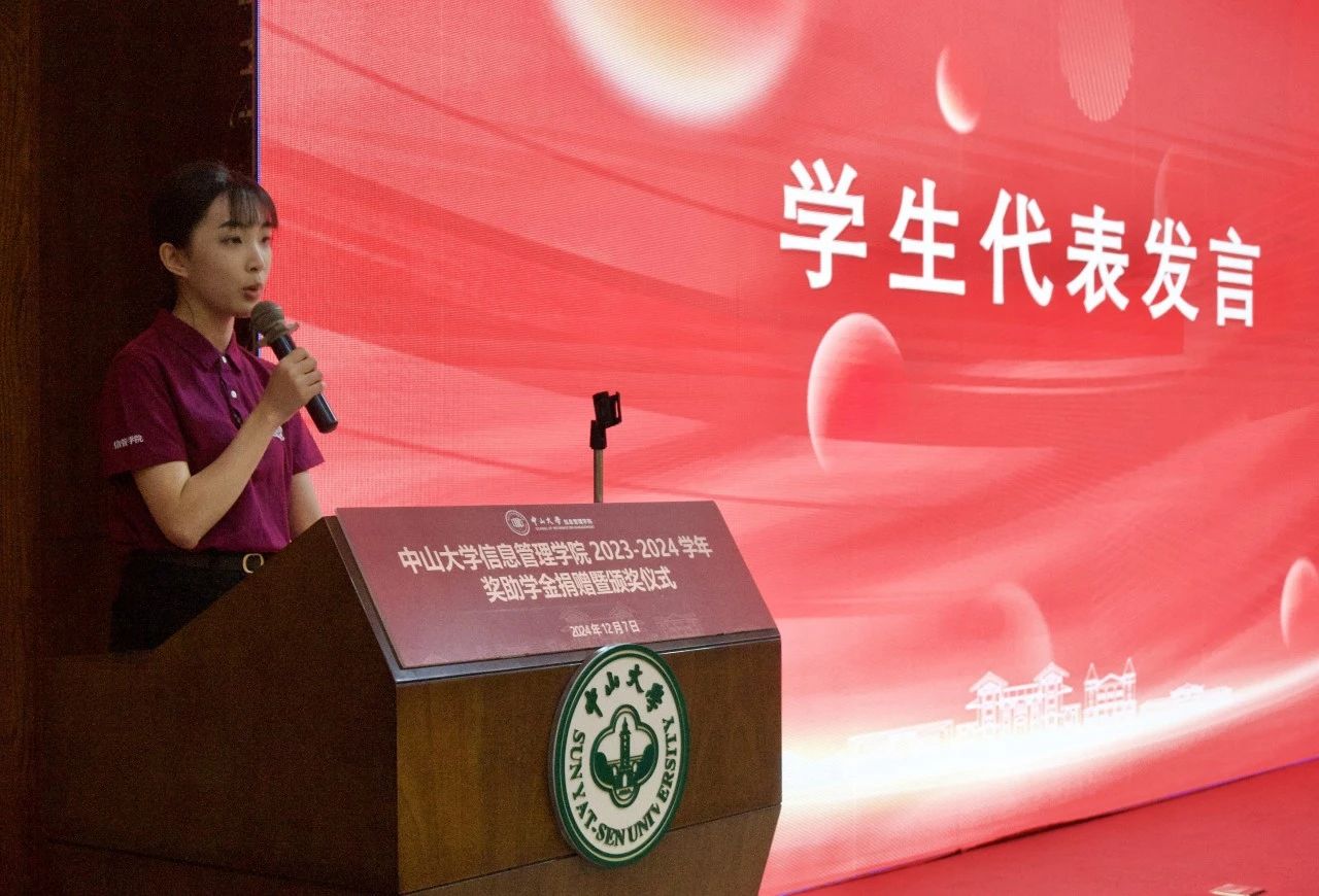 学生代表苏丹妮同学在发言中表达了对国家、学院培养和捐助方慷慨捐赠的感谢。国家始终秉持把教育作为“国之大计、党之大计”,持续加大对教育的投入,国家奖学金名额扩增、标准提高寄托着国家对青年成长的关心关怀和对青年未来的厚望与重托。而学院提供的丰富教育资源和科研平台则让学生得以参加各类学术活动,拓展学术视野,锻炼科研能力。苏丹妮同学表示,我们将会以更加坚定的信念面对未来的挑战,以更加扎实的学识回馈社会。