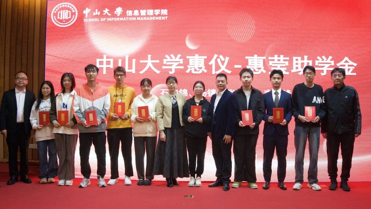 图 胡毅女士、张洋院长、林俊洪书记、程焕文教授为惠仪-惠莹助学金获奖学生颁奖