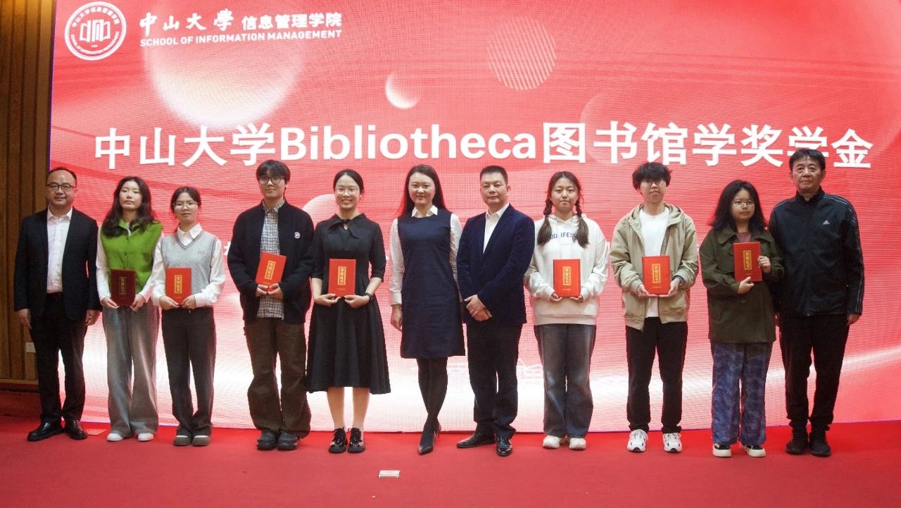 图 王斐女士、张洋院长、林俊洪书记、程焕文教授为Bibliotheca图书馆学奖学金获奖学生颁奖