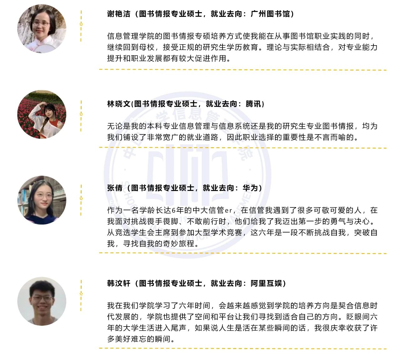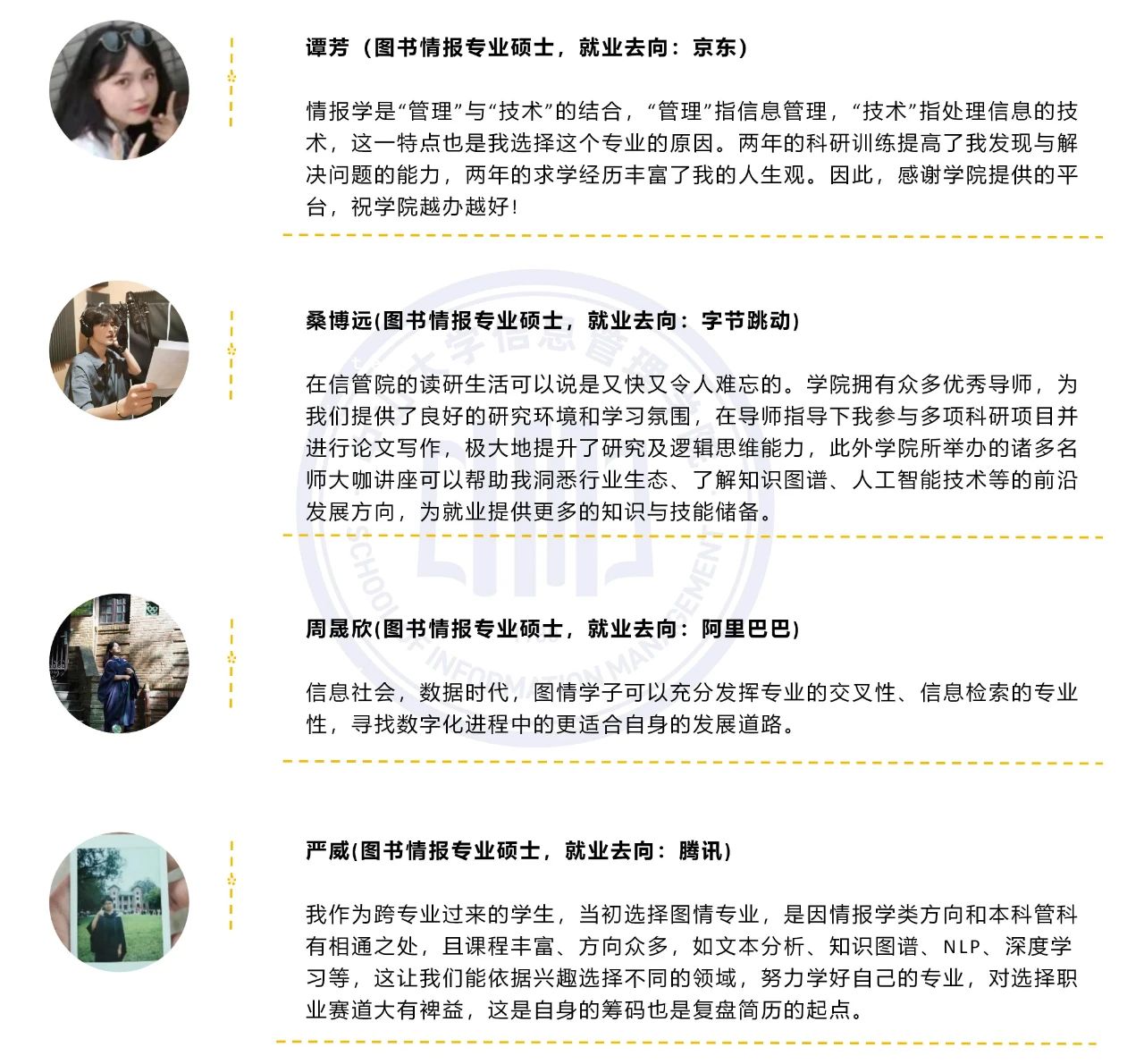 永利yl23411拥有信息资源管理学术学位硕士,以及图书情报专业(全日制、非全日制)硕士和文献与文化遗产保护专业(全日制)硕士两个专业学位硕士,各具特色与优势,致力于培养适应社会需求的高层次专业人才。