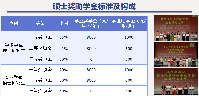 学院研究生奖助学金资助体系完备,构建起多元支持网络。除国家奖学金、中山大学优秀学生奖学金外,还包括学院自设多种专项奖助,年均资助金额达25万,为信管学子成长添翼。超七成全日制研究生在读阶段至少收获一次奖助学金,以切实保障助力学术逐梦。