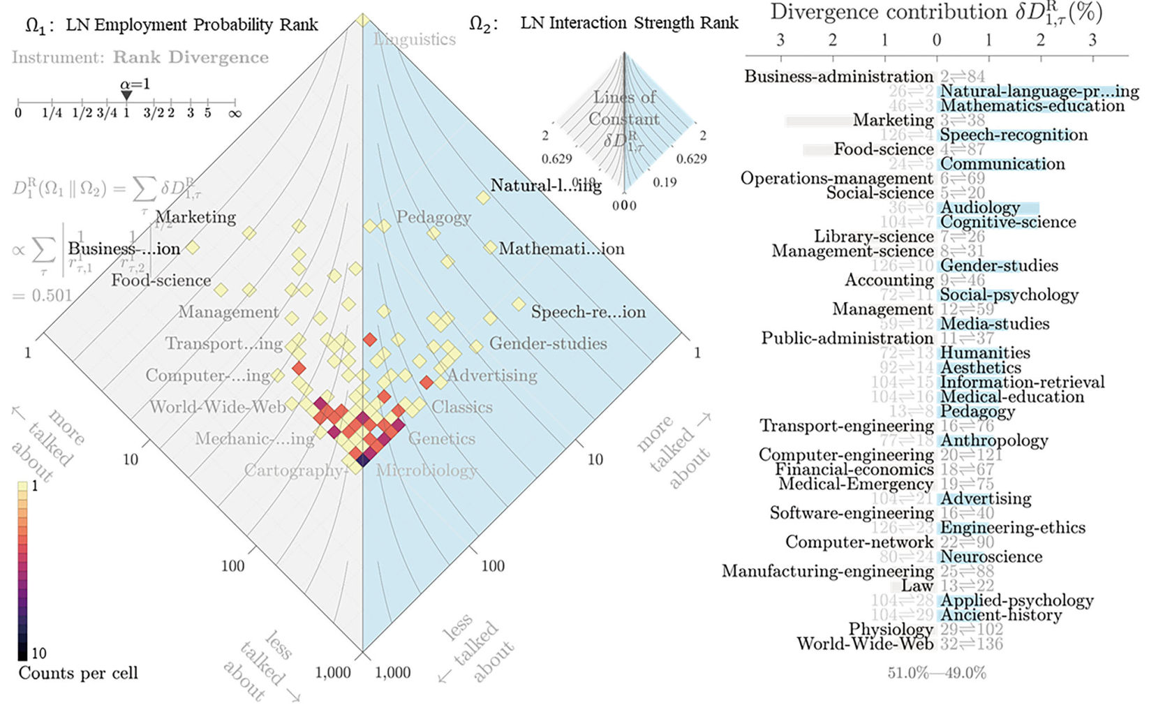除了广泛领域的分布分析,本研究进一步对学科之间的引文交互强度与其现实就业概率的排名变动情况进行可视化对比分析,也就是分析从业者是否更趋向于跨入距离源学科更近的学科就业。以图书馆学为例,其学科排名散度图如下所示。