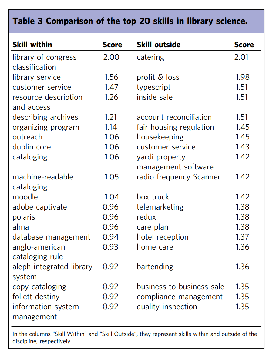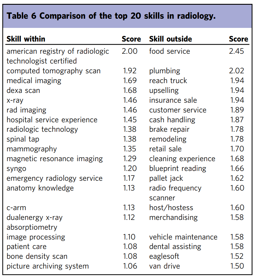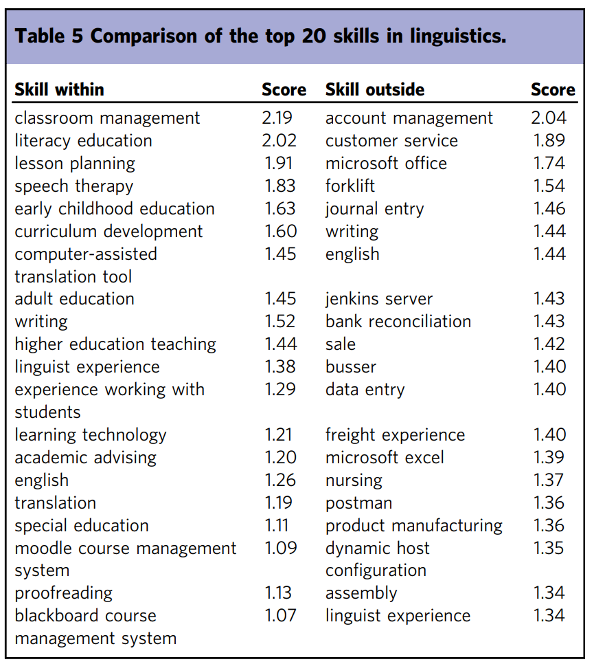 能力层面,学科领域内、外就业所需要具备的能力之间存在差异。图书馆学与放射学的专业能力在本领域至关重要,但对于跨领域就业的从业者来说,客户接待与商品推销等软性技能更有助于实现职业拓展的目标。语言学与电子工程学领域的专业能力不仅在本领域至关重要,在领域之外的职业中的适用性也较强。