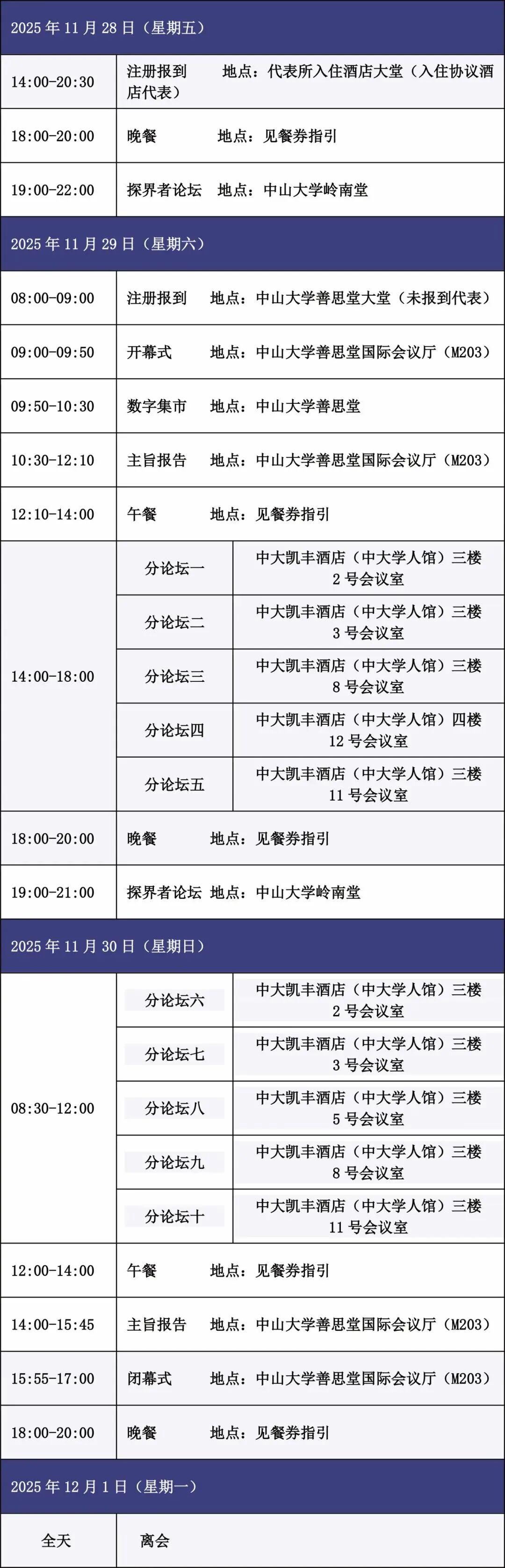 11 月 28 日未办理注册报到的代表,以及不入住会议协议酒店的参会代表,请于 2025 年 11 月 29 日 8:00-9:00 在会议开幕式会场(中山大学善思堂国际会议厅)现场办理注册报到。