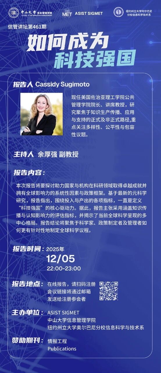 Cassidy Sugimoto,现任美国佐治亚理工学院公共管理学院院长、讲席教授,研究聚焦于知识生产传播、应用与支持的正式及非正式路径重点关注多样性、公平性与包容性议题。